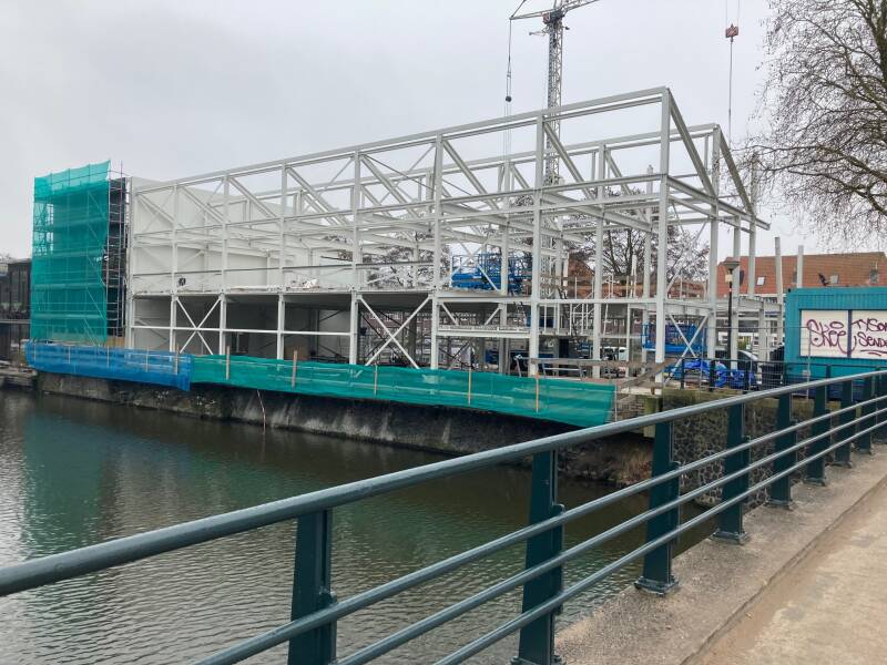 Het typerende sheddak is al duidelijk herkenbaar en verwijst naar een industriële activiteit. Naar alle waarschijnlijkheid draait de brouwerij eind 2026 weer op volle toeren en vloeit het bier.
