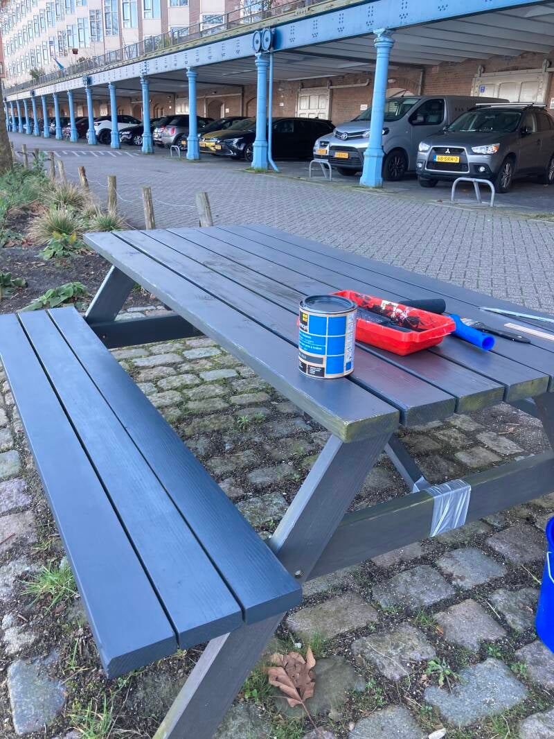 Nu de dagen gaan lengen en de temperatuur stijgt, hebben we de kwast tevoorschijn gehaald om de picknickbank voor ons pakhuis een onderhoudsbeurt te geven. De bank staat immers het hele jaar in weer en wind en kon wat aandacht gebruiken.